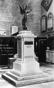 population at that time – and 101 of them never returned. The old Norman font in the Abbey had been replaced with a new one in 1840: the memorial was erected in 1921 on the site of this Victorian font. At this time, the old font was restored and the Victorian one sent to a church in Ceylon. The Memorial was sculpted by Alfred Drury R.A., and consists of a stone pedestal surmounted by a figure of Immortality holding an Olive Branch of Peace and a Crown of Everlasting life. This photograph is from a 1930s postcard – the electric light fitting just visible in the background on the left dates the original photo to some time after the Abbey’s electrical lighting installation in 1928. The only change to the memorial since then has been the addition of the names of the dead from WW II. A leaflet about the memorial is available from the Abbey bookstall. |